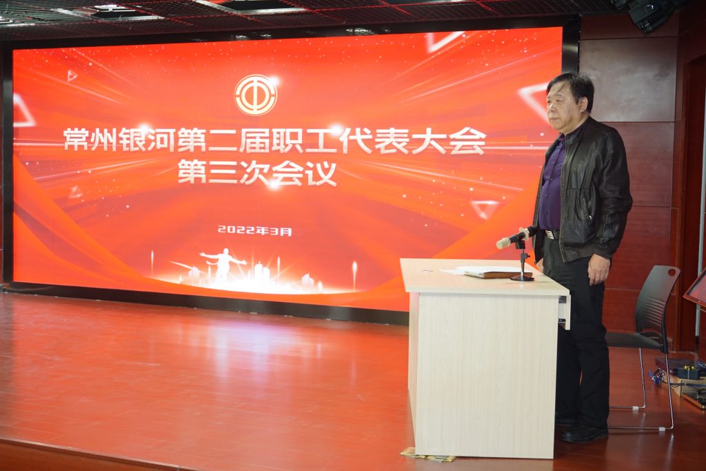 ? ? ? ? 2022年3月12日下午,常州銀河第二屆第三次職工代表大會在電器黨群活動中心隆重舉行,90余位職工代表參加了會議。會議由黨總支部書記、工會主席韓澎主持。大會在莊嚴的國歌聲中開幕,公司總經理岳廉作了以“凝心聚力謀發展,深化改革再創業”為主題的2021年度經營工作報告。報告指出:2021年,我們超額完成了公司年度各項目標任務,經營業績大幅度提高,員工收入也穩步增長,2022年,我們將進一步強化核心優勢,提升組織效率,加強全面管理,為確保公司完成2022年度目標而努力。